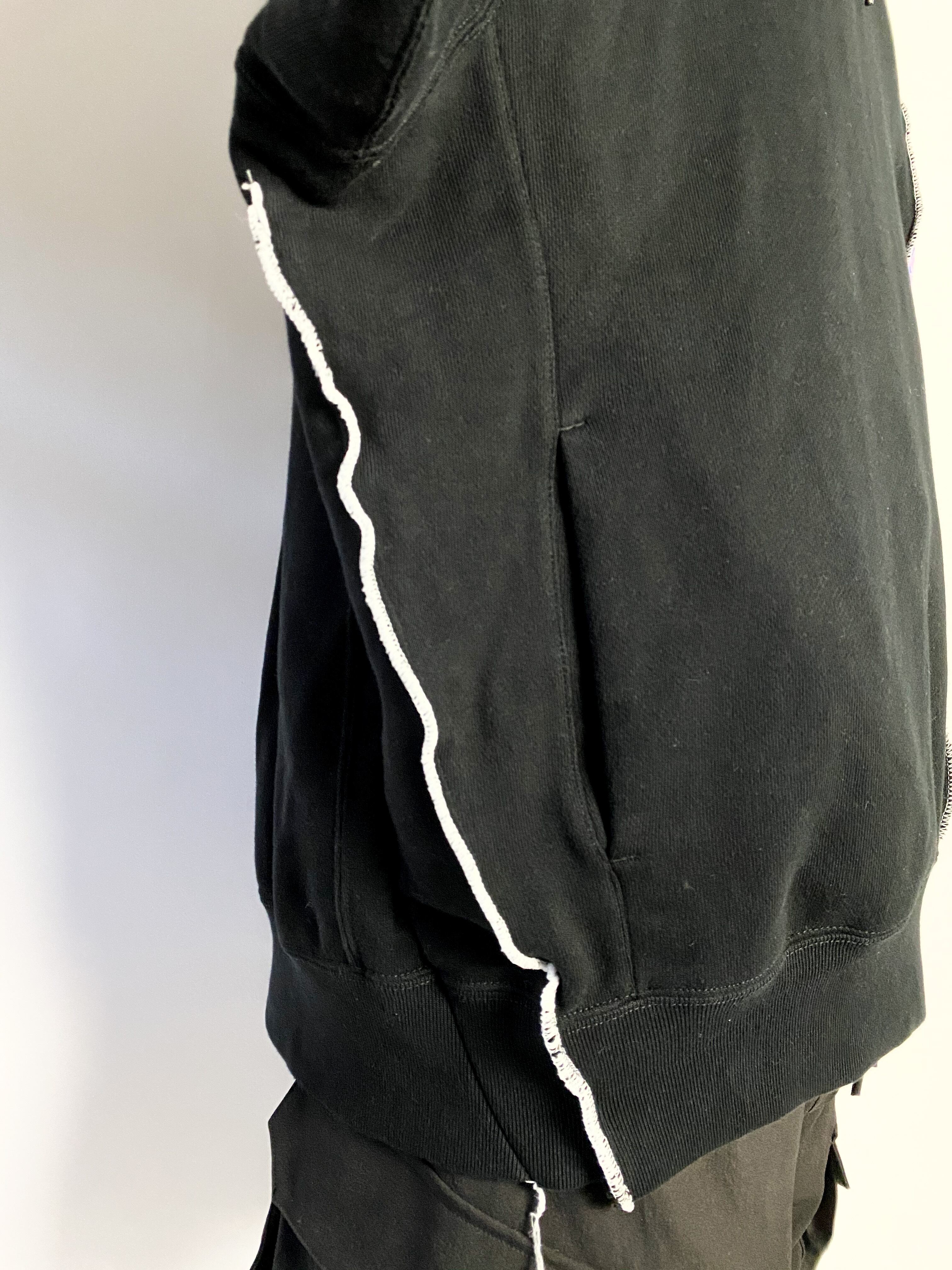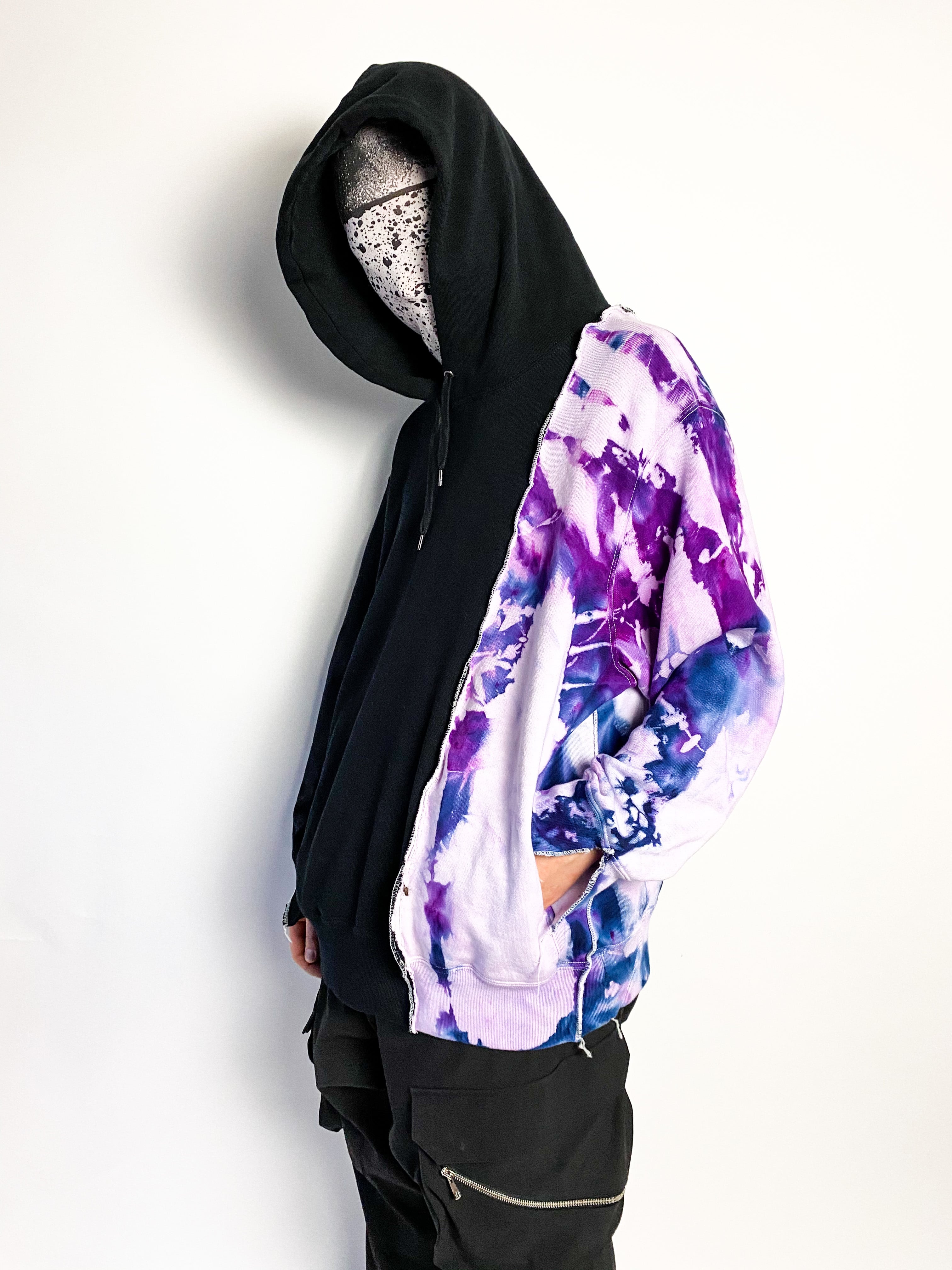ガーメントダイを行ったオーバーサイズのフーディをリメイクしてブラックのものとドッキング しています。