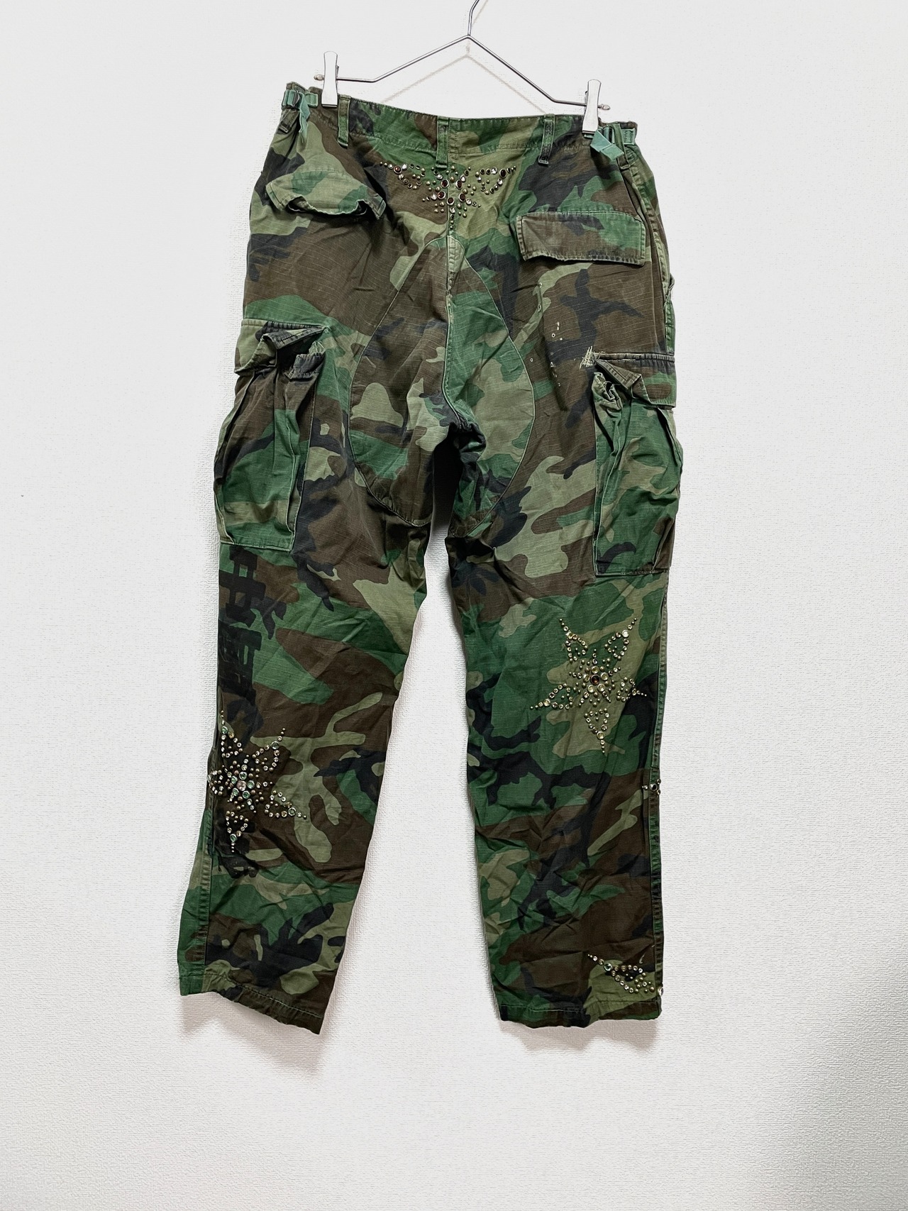 スタッズやラインストーンでリメイクが施されたパンツです。